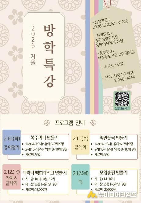 모집 인원은 유아 및 어린이 54명이며, 프로그램은 2월 10일부터 12일까지 3일간 서충주도서관 2층 강의실에서 진행된다.