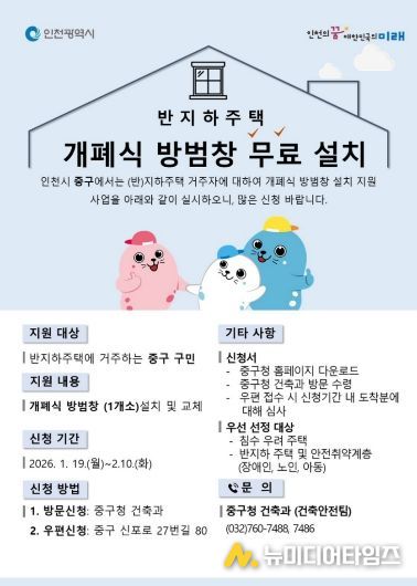 인천시 중구는 올해에도 반지하주택을 대상으로 ‘개폐식 방범창’ 설치를 무상 지원하며, 침수 피해 예방에 나선다고 20일 밝혔다.