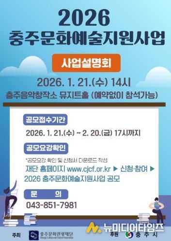 (재)충주문화관광재단은 충주시 예술인 및 예술단체의 창작활동 기반을 마련하여 문화예술 생태계를 조성하고자 1월 19일부터‘2026 충주문화예술지원사업’공모를 진행하고 있다고 밝혔다.