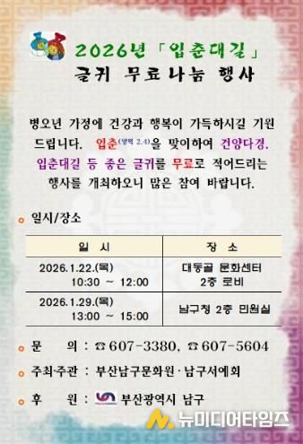 이번 행사는 부산남구문화원이 주최하고 남구문화예술회 서예회가 주관하며, 서예가들이 직접 참여해 전통의 멋과 정성을 담은 입춘방을 무료로 나눌 예정이다.
