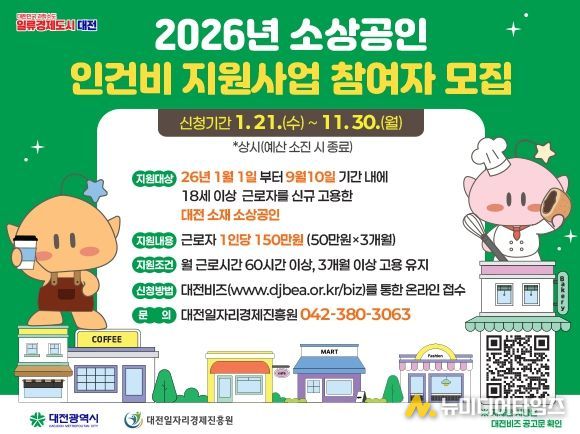 대전시는 경기 침체와 인건비 상승으로 어려움을 겪고 있는 지역 소상공인의 경영 부담을 완화하기 위해 ‘2026년 소상공인 인건비 지원사업’을 시행한다.