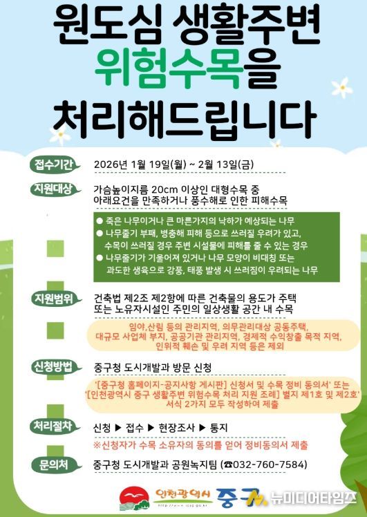 인천시 중구는 원도심 권역을 대상으로 ‘2026년도 원도심 생활 주변 위험 수목 처리지원 사업’을 추진한다고 21일 밝혔다.