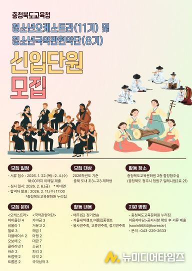 충청북도교육청 직속기관 교육문화원은 2026년도 충청북도교육청청소년오케스트라 및 청소년국악관현악단의 신입단원을 모집한다.