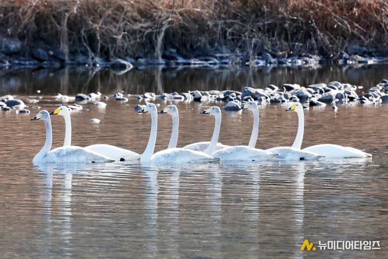충북 괴산 달천강에 내려앉은 ‘겨울 진객’… 큰고니 가족의 평화로운 외출청정 괴산의 생태 지표로 주목영하권 추위가 몰아친 충북 괴산군 달천강변에 반가운 손님이 찾아왔다.