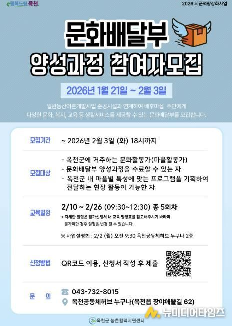 옥천군이 2026년 시군역량강화사업의 일환으로 '2026 문화배달부 양성과정' 교육 참여자를 모집한다고 밝혔다.
