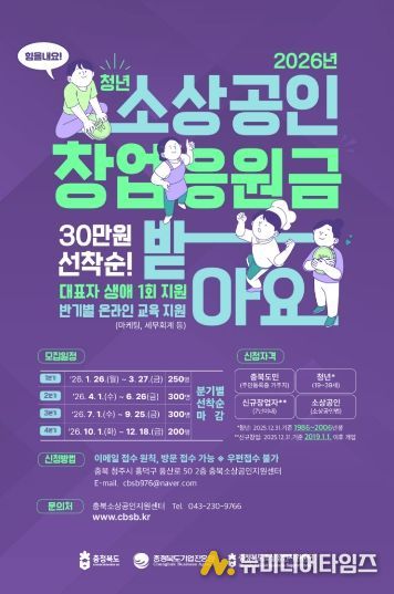 충북도와 (재)충청북도기업진흥원(소상공인지원센터)이 ‘2026년 청년 소상공인 창업응원금 지원사업’의 1분기 참여자 250명을 1월 26일부터 오는 3월 27일까지 선착순으로 모집한다.