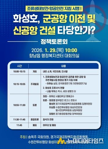 한편, '‘조류생태보전·항공안전 지침 시행!’ 화성호, 군공항 이전 및 신공항 건설 타당한가' 정책토론회는 1월 29일 오전 10시, 화성시 향남읍 행정복지센터 대회의실에서 열린다.