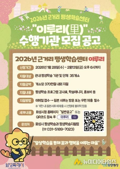 화성특례시는 오는 28일부터 2월 13일까지 2026년 근거리 평생학습센터 ‘이루리’ 운영 지원사업의 수행기관을 공개 모집한다고 23일 밝혔다.