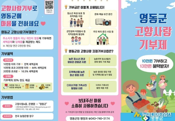 군 관계자는 “앞으로도 군민 삶의 질을 높이는 기금사업과 영동만의 특색 있는 답례품을 지속 발굴해 기부자가 다시 찾는 고향사랑기부제를 만들어가겠다”라고 말했다.