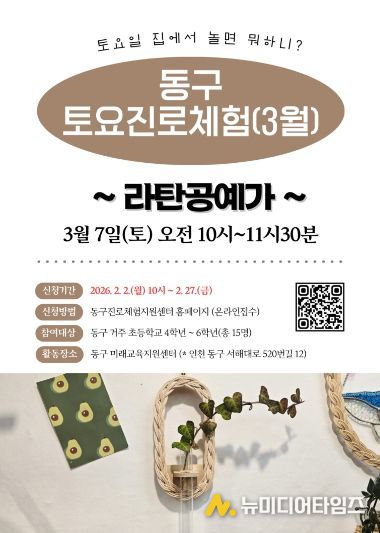 참여를 희망하는 학생은 오는 2월 2일~2월 27일까지 인천 동구진로체험지원센터 홈페이지를 통해 온라인으로 신청할 수 있으며, 참가비는 전액 무료다. 자세한 사항은 동구진로체험지원센터로 문의하면 된다.