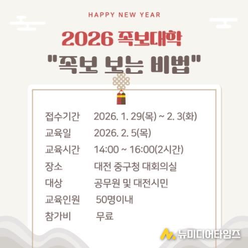 이번 교육은 오는 2월 5일 오후 2시부터 4시까지 중구청 대회의실에서 대전 시민 및 공무원 50명을 대상으로 무료로 진행된다.