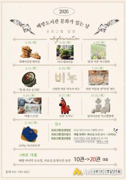 배방도서관은 2월부터 11월까지 매달 하루를 지정해 ‘도서관 문화가 있는 날’ 프로그램을 운영할 계획이다.