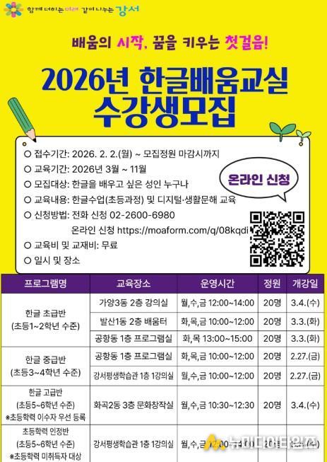 한글을 배우고 싶은 강서구 거주 성인이면 누구나 신청할 수 있고, 정원 마감 시까지 전화 및 온라인으로 접수하면 된다. 수업료와 교재는 전액 무료다.