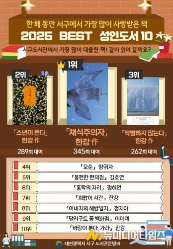 대전 서구는 지난 한 해 성인 도서와 아동 도서 두 부문 ‘2025년 서구에서 가장 사랑받은 도서 대출 순위'를 2일 공개했다.