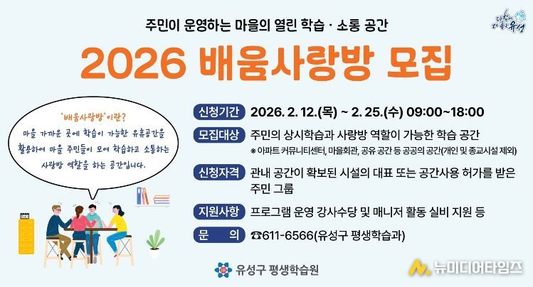 정용래 유성구청장은 “배움사랑방은 주민이 주체로 배우고 소통하는 생활 속 학습 공간”이라며 “배움사랑방이 지역 맞춤형 평생학습 거점으로 자리 잡을 수 있도록 지원하겠다”라고 말했다.