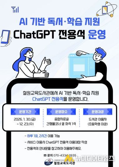 철원교육도서관(관장 김민서)은 2026년부터 종합자료실에서 도서관 이용자를 대상으로 인공지능(AI) 기반 독서․학습 지원 챗지피티(ChatGPT) 전용석을 운영한다.