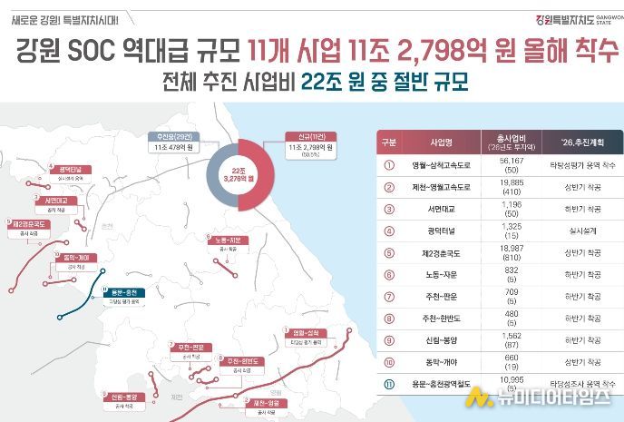 강원특별자치도는 현재 추진 중인 SOC 교통망 사업 22조 원 가운데 절반이 넘는 11조 원 규모의 사업을 올해 본격 착수한다고 밝혔다.