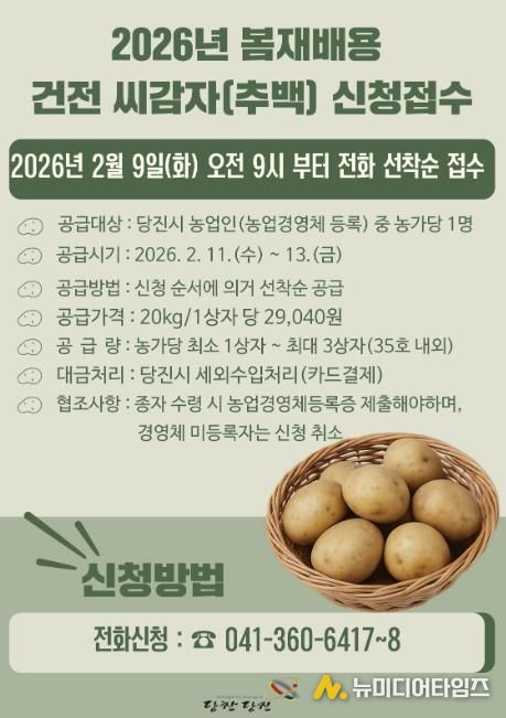당진시는 봄 재배용으로 활용될 조직배양 ‘추백’ 씨감자 원종 2톤을 관내 농가에 공급하기 위해 오는 9일 오전 9시부터 선착순으로 신청을 받는다고 3일 밝혔다.