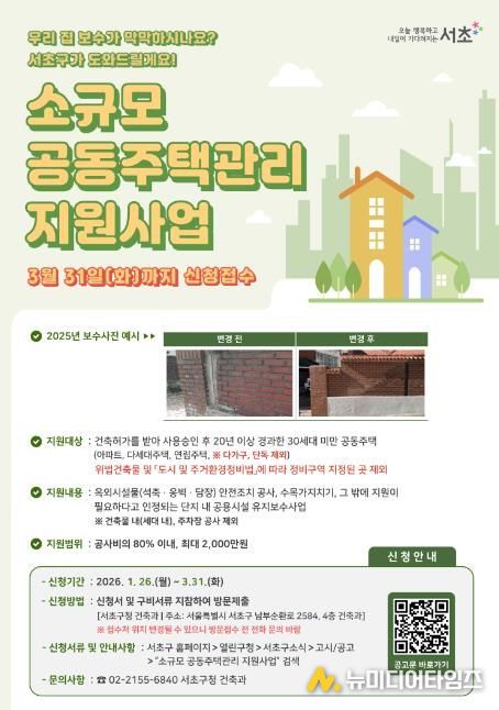 서울 서초구가 사각지대에 놓이기 쉬운 소규모 공동주택의 위험 요인을 제거하고 구민들의 노후된 주거 환경을 개선하기 위해 ‘2026 소규모 공동주택관리 지원사업’을 본격 추진한다고 밝혔다.
