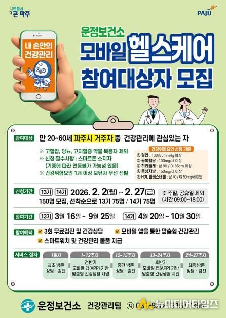 파주시 운정보건소는 시민의 자가 건강관리 능력 향상과 만성질환 예방을 위해 2026년 ‘모바일 헬스케어 사업’참여자를 모집한다.