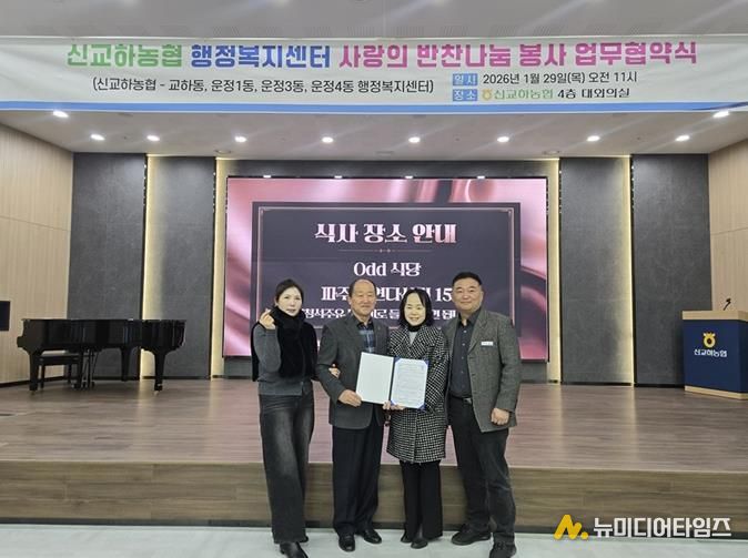 파주시 운정1동 지역사회보장협의체는 지난 29일, 신교하농협 4층 대강당에서 신교하농협 고향주부모임과 함께 취약계층 식생활 지원을 위한 반찬 나눔 업무협약을 체결했다.
