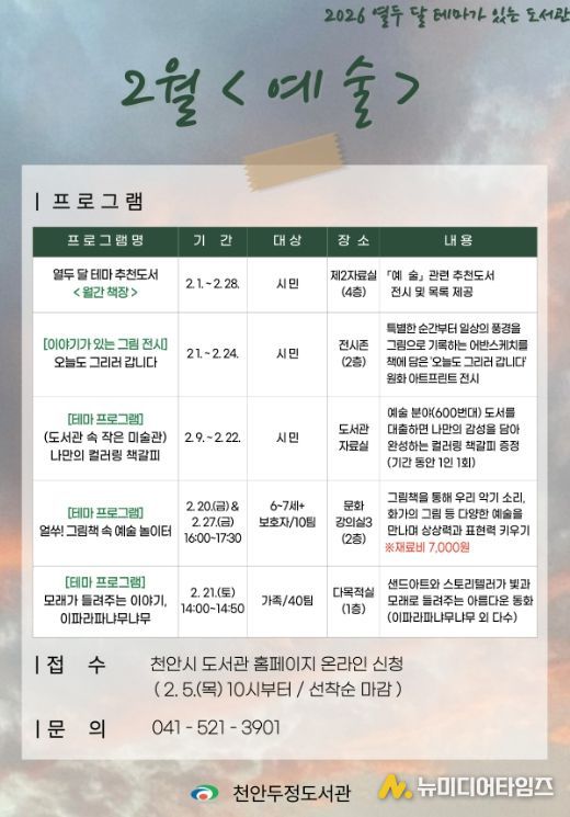 천안시 두정도서관이 2월 한 달간 ‘예술’을 테마로 도서관을 운영한다고 3일 밝혔다.