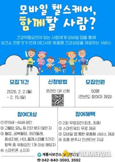 충남 계룡시는 시민의 자발적인 건강관리 지원을 위해 오는 15일까지 ‘모바일 헬스케어’ 사업 참여자 50명을 모집한다고 밝혔다.
