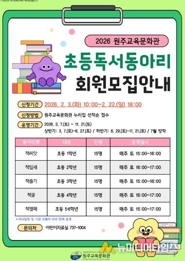 원주교육문화관(관장 용석태)은 2월 3일부터 선정 도서를 깊이 읽는 활동을 통해 문해력을 강화하고 지역사회 독서 공동체를 활성화하기 위해 초등학생과 중학생을 대상으로 ‘2026년 독서동아리 회원 모집’을 실시한다.