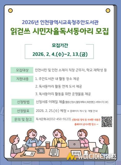인천광역시교육청주안도서관은 지역주민의 자발적 독서문화 확산을 위하여 2월 4일부터‘2026년 읽걷쓰 시민자율독서동아리’를 모집한다.