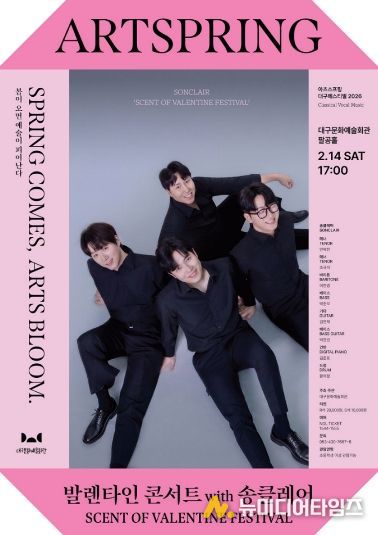 대구문화예술진흥원 대구문화예술회관은 오는 2월 14일 오후 5시, 팔공홀에서 지역 성악가로 구성된 남성 4인조 크로스오버 보컬 그룹 송클레어(SONCLAIR)와 함께하는 ‘발렌타인 콘서트 with 송클레어 – Scent of Valentine Festival’을 개최한다.