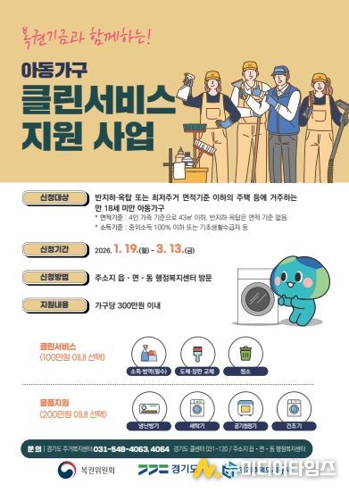 경기도에서 열악한 주거환경에 거주하는 아동가구들을 위한 ‘아동가구 클린서비스 지원 사업’을 복권기금과 함께 추진한다.