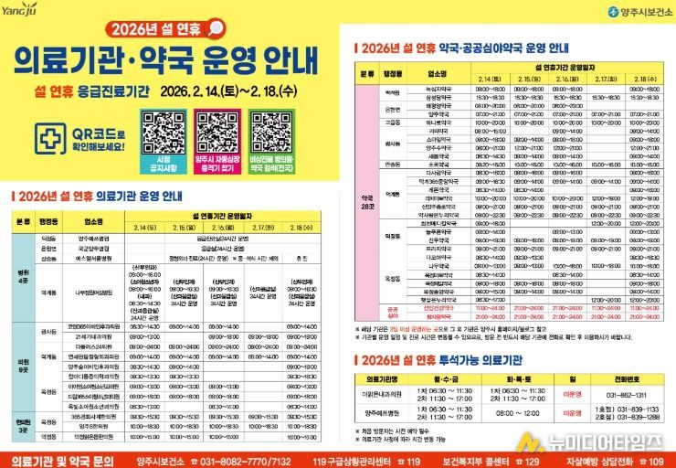 설날 연휴 기간 운영 의료기관 및 약국 정보는 ▲양주시 보건소 ▲119구급상황관리센터(☎ 119) ▲보건복지부 콜센터(☎ 129)를 통해 문의할 수 있다.