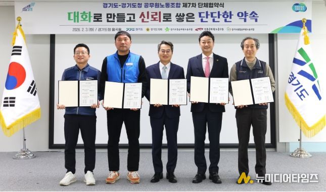 이날 단체협약식에는 김동연 도지사와 김성중 행정1부지사, 강순하 경기도청공무원노조 위원장, 민을수 전국공무원노조 경기도청지부장, 백승진 경기도통합공무원노조 위원장 및 노조 교섭위원 등이 함께 했다.
