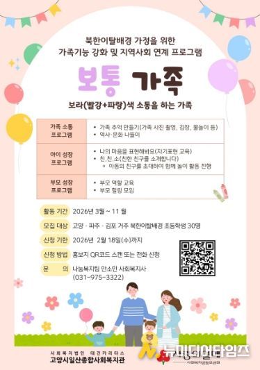 고양시일산종합사회복지관이 북한이탈배경 가정의 가족기능 강화 및 지역사회 통합 프로그램 ‘보통 가족’의 참여자를 이달 18일까지 모집한다.