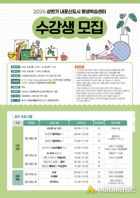 예산군 내포신도시 평생학습센터는 2월 9일부터 19일까지 상반기 프로그램 수강생을 모집하고 3월 9일부터 본격적인 프로그램 운영에 들어간다고 밝혔다.