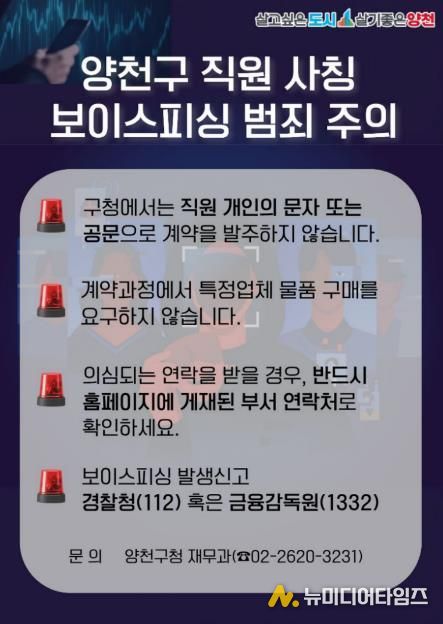 양천구(구청장 이기재)는 최근 양천구청 직원을 사칭해 물품대금 선입금을 요구하는 사기 범죄가 급증함에 따라, 유사 피해가 발생하지 않도록 각별한 주의와 함께 선제적인 피해 예방에 나선다고 4일 밝혔다.