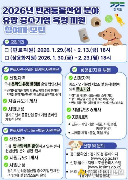 경기도가 ‘반려동물산업 분야 유망 중소기업 육성 지원사업’ 참여 보조사업자를 모집한다.