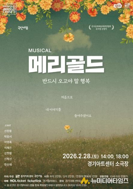 또, 경기아트센터 소극장에서 공연하는 뮤지컬 ‘메리골드’ 관람 할인 문화소비쿠폰이 지원된다. 공연은 오는 28일 토요일 오후 2시와 6시 총 2회 진행되며, 좌석 등급은 R석(3만 원), S석(2만 원), 만원의 행복석(1만 원)으로 구성된다.