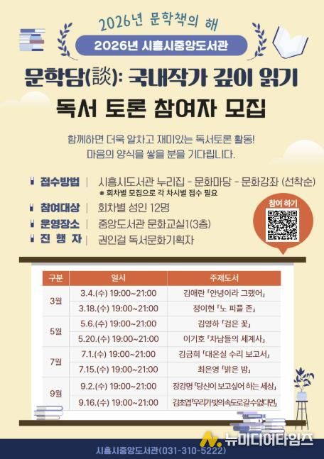 시흥시중앙도서관은 ‘2026년 문학책의 해’를 맞아 국내 대표 문학 작가 소설을 주제로 한 독서토론 ‘문학담(談): 국내 작가 깊이 읽기’를 오는 3월부터 9월까지 운영한다.