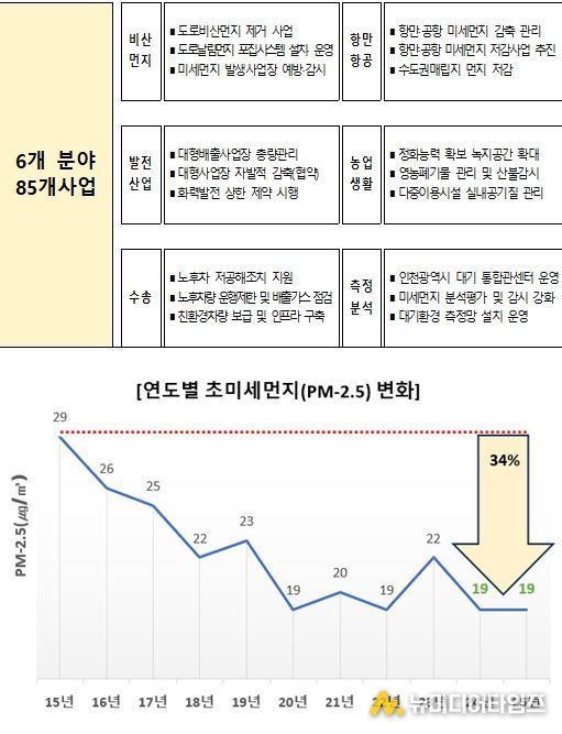 인천시는‘내 삶이 행복한, 미세먼지 걱정 없는 도시’를 비전으로 '인천광역시 미세먼지 저감 종합대책'을 수립·추진한 결과, 2024~2025년 초미세먼지(PM-2.5) 연평균 농도가 19㎍/㎥로 관측을 시작한 2015년(29㎍/㎥) 대비 10㎍/㎥(△34.5%) 감소하며, 관측 이래 최저치를 기록했다고 밝혔다.