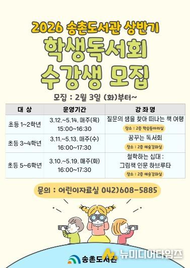 대전 대덕구 송촌도서관은 어린이들의 올바른 독서 습관 형성과 창의적 사고력 증진을 위해 ‘2026년 상반기 학생독서회’ 수강생을 모집한다.