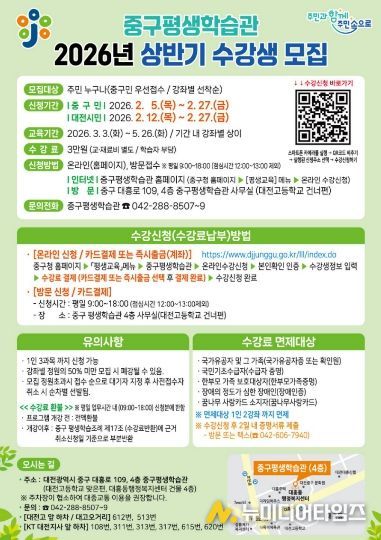 대전 중구는 2월 5일부터 2026년 상반기 중구 평생 학습관 프로그램 수강생을 선착순 모집한다고 밝혔다.