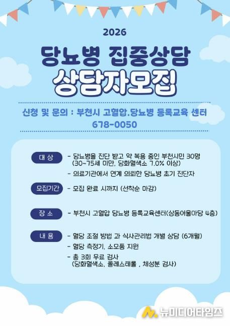 신청 대상은 30세 이상 75세 미만으로, 당화혈색소 7.0% 이상인 당뇨병을 진단받은 부천시민이다. 참여자로 선정되면 간호사와 영양사로 구성된 건강매니저가 팀을 이뤄 6개월간 개별 맞춤형 관리를 지원한다. 신청은 유선을 통해 가능하며, 모집은 선착순으로 완료 시까지 진행된다.