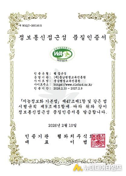 충남평생교육진흥원은 과학기술정보통신부 지정 국가공인 인증기관(㈜웹와치)으로부터 정보통신접근성 품질인증을 획득했다고 밝혔다.