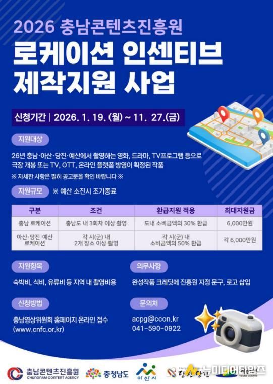 본 사업은 충남에서 촬영하는 작품을 대상으로 도내 소비 금액의 일부를 환급하는 지원사업으로, 올해부터는 기존 충남도·당진시에 더해 아산시와 예산군이 새롭게 합류하며 지원범위가 확대됐다.