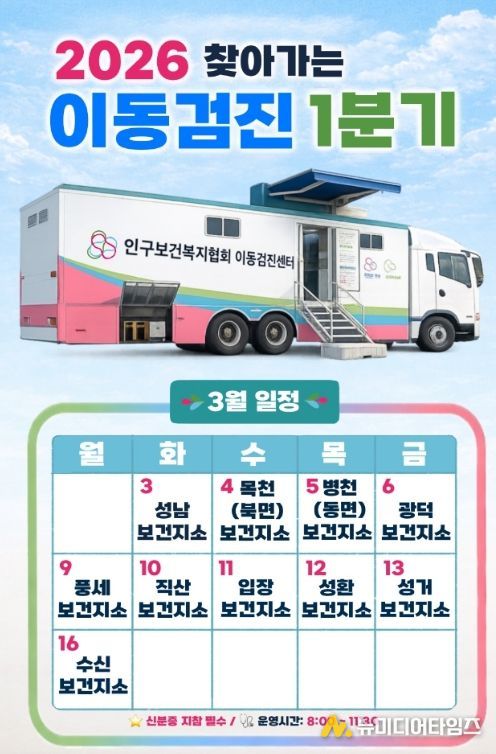 이현기 서북구보건소장은 “읍면 주민들이 가까운 곳에서 편리하게 건강 상태를 확인할 수 있도록 마련한 사업”이라며 “다양한 검사를 한 번에 받을 수 있는 만큼 적극적인 참여를 바란다”고 말했다.
