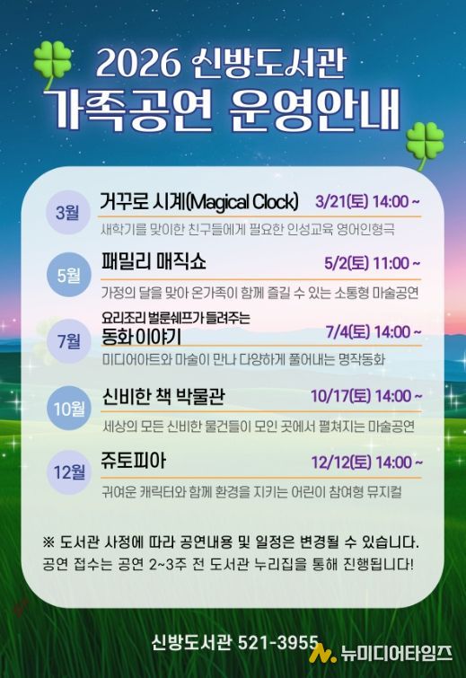 천안시 신방도서관은 가족특화도서관의 특성을 살려 연중 온 가족이 함께 즐길 수 있는 ‘2026 가족 공연’ 프로그램을 운영한다고 5일 밝혔다.