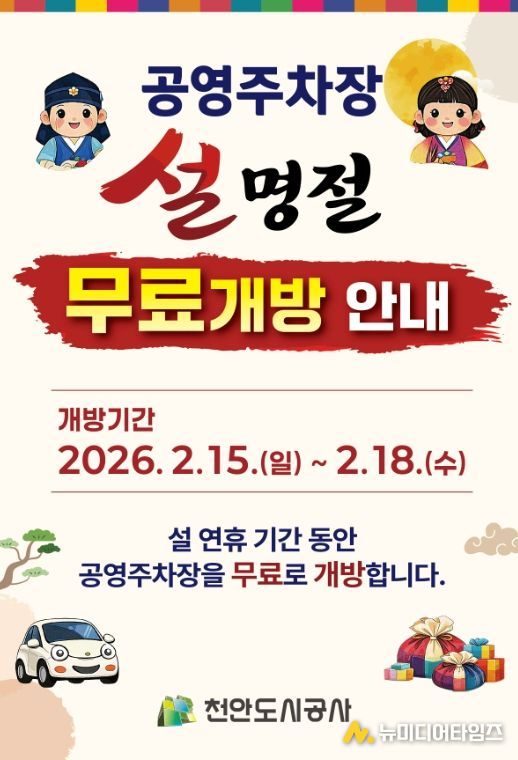신광호 천안도시공사 사장은 “설 명절을 맞아 전통시장과 지역 상권을 찾는 시민들께서 주차 걱정없이 편리하게 이용하시기를 바란다”며 “지역 상권 활성화에도 도움이 되기를 기대한다”고 말했다.