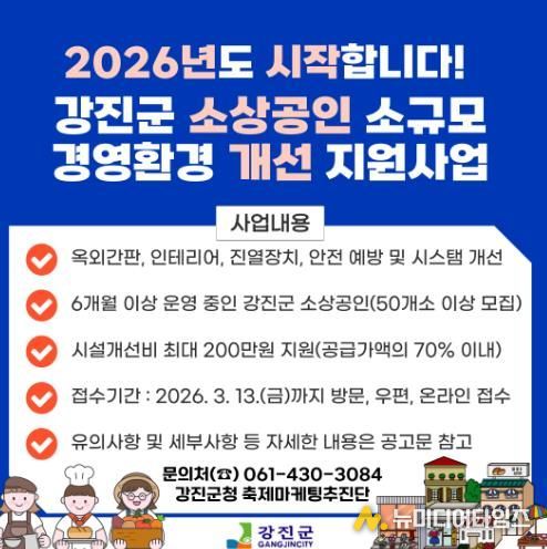 강진군이 지역 소상공인의 영업환경 개선과 경영 안정화를 돕기 위해 노후화된 시설을 맞춤형으로 개선할 수 있는 지원사업을 모집한다.