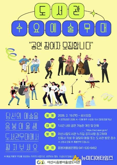 아산시 관계자는 “지난해 26회의 공연을 통해 도서관 수요예술무대가 시민들에게 친숙한 문화 프로그램으로 자리 잡았다”며 “올해도 다양한 예술가들의 참여를 통해 도서관이 지역 문화 거점으로서 역할을 더욱 확대해 나가길 기대한다”고 말했다.